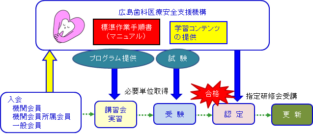 無床の歯科診療所で歯科医療安全を担保する上で必要な、知識、技能の習得を機構独自の講習会・実習で教育し、十分な知識・技能を持ち、積極的な活動をする歯科医師・歯科衛生士を試験によって認定します。